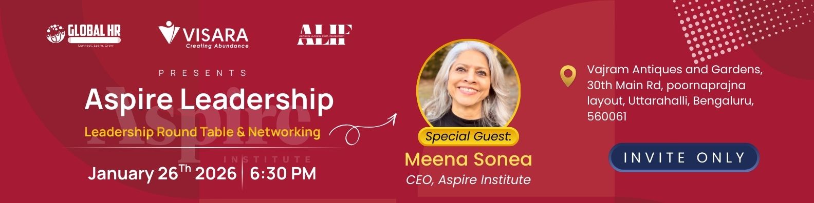 Visara Partners , in partnership with Global HR Community , is honoured to host an exclusive Leadership Roundtable & Networking Dinner in Bengaluru, featuring Meena…
